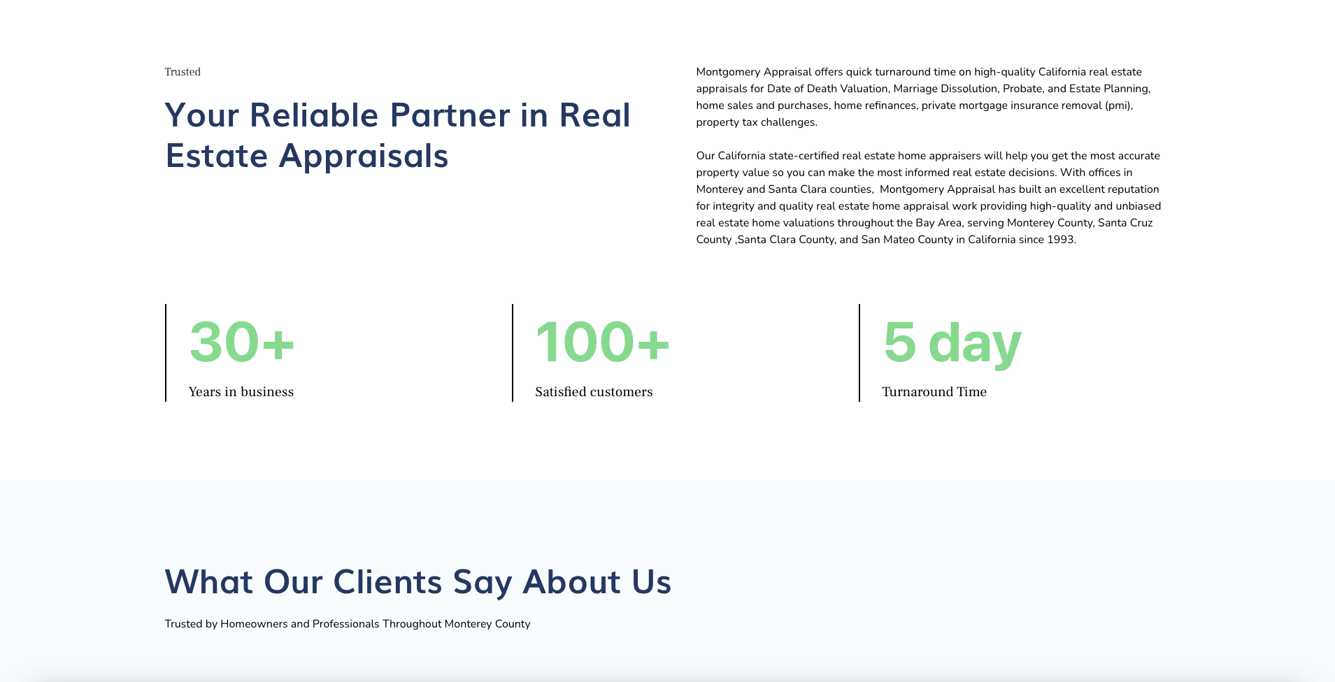 Website design and development for Montgomery Appraisal, a local real estate appraisal service. The project prioritized search engine optimization to attract local clientele through Google search rankings. I created a clean, service focused website with optimized content structure, local SEO implementation, and clear calls to action. The site now ranks #1 on Google for desired search keywords, consistently driving qualified local leads.